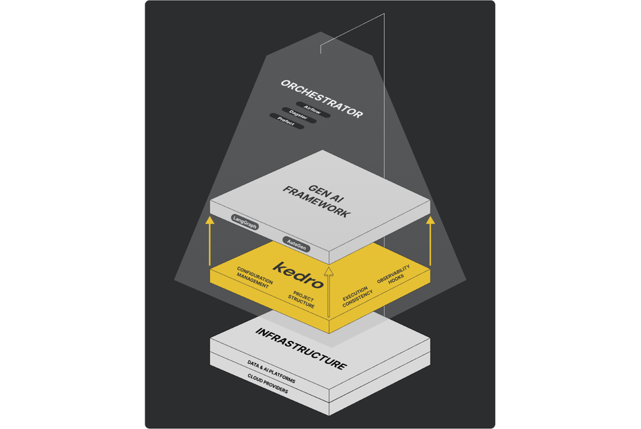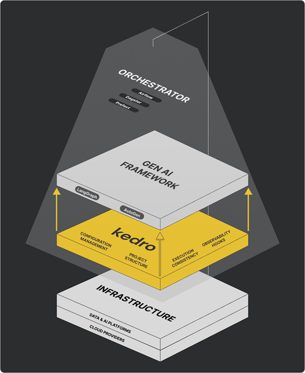 Kedro is intentionally not a pure orchestrator. Instead, it focuses on how pipeline logic is structured and expressed, while remaining compatible with a wide range of execution and orchestration environments. Likewise, it is not designed to replace gen AI or modeling frameworks, but to integrate with them as part of a broader ecosystem.