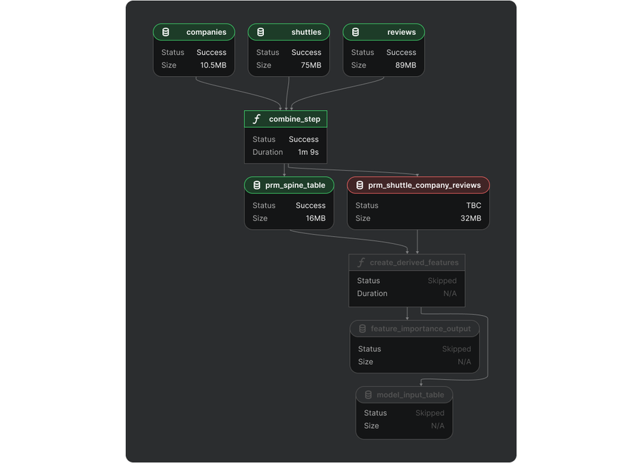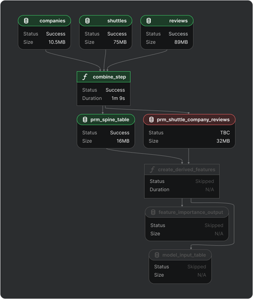 Kedro-Viz complements these design principles by providing an interactive way to explore pipelines, nodes, and datasets, adding a layer of observability to the development experience. Instead of gathering information about workflows purely through code, users can visually inspect how data moves through the system, which improves comprehension and communication—especially as pipelines become more complex. Beyond static visualization, Kedro-Viz also surfaces run status information, showing whether individual nodes or pipelines have succeeded, failed, or been skipped. This execution-level feedback makes it easier to debug issues, trace failures, and understand pipeline behavior during and after runs.