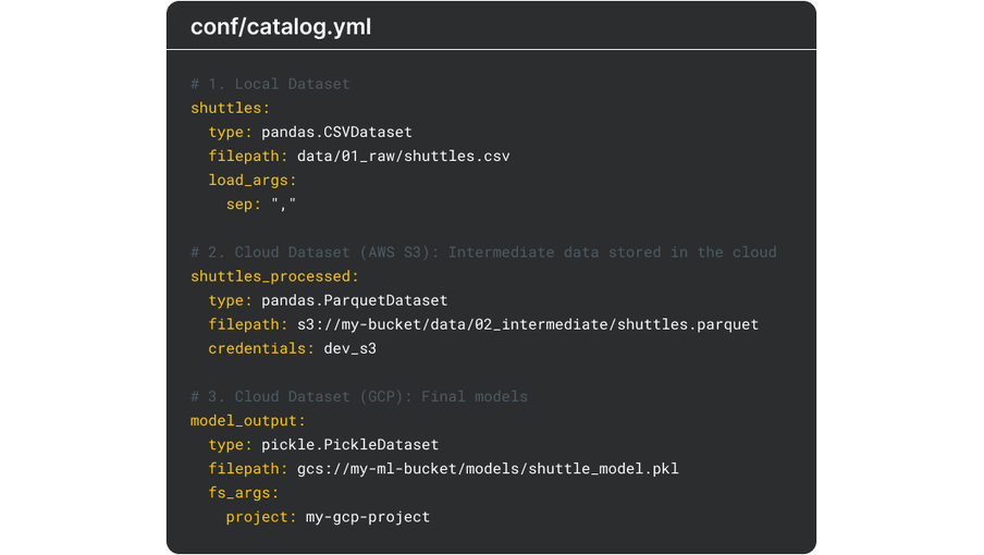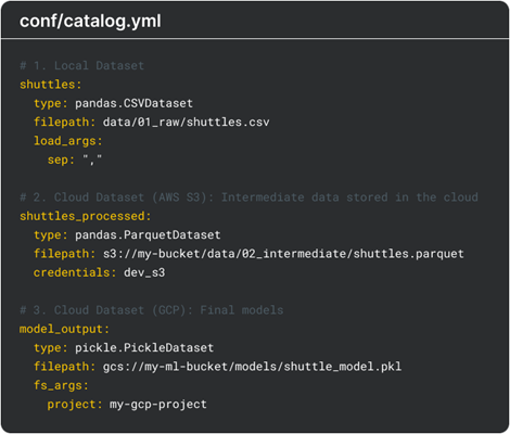 Data access is abstracted through a data catalog. It formalizes how data is accessed, versioned, and managed across a project, preventing file paths and storage logic from being scattered throughout the codebase. This separation of concerns simplifies environment changes, for example, local to cloud, improves reproducibility, and creates a consistent contract between data and logic.