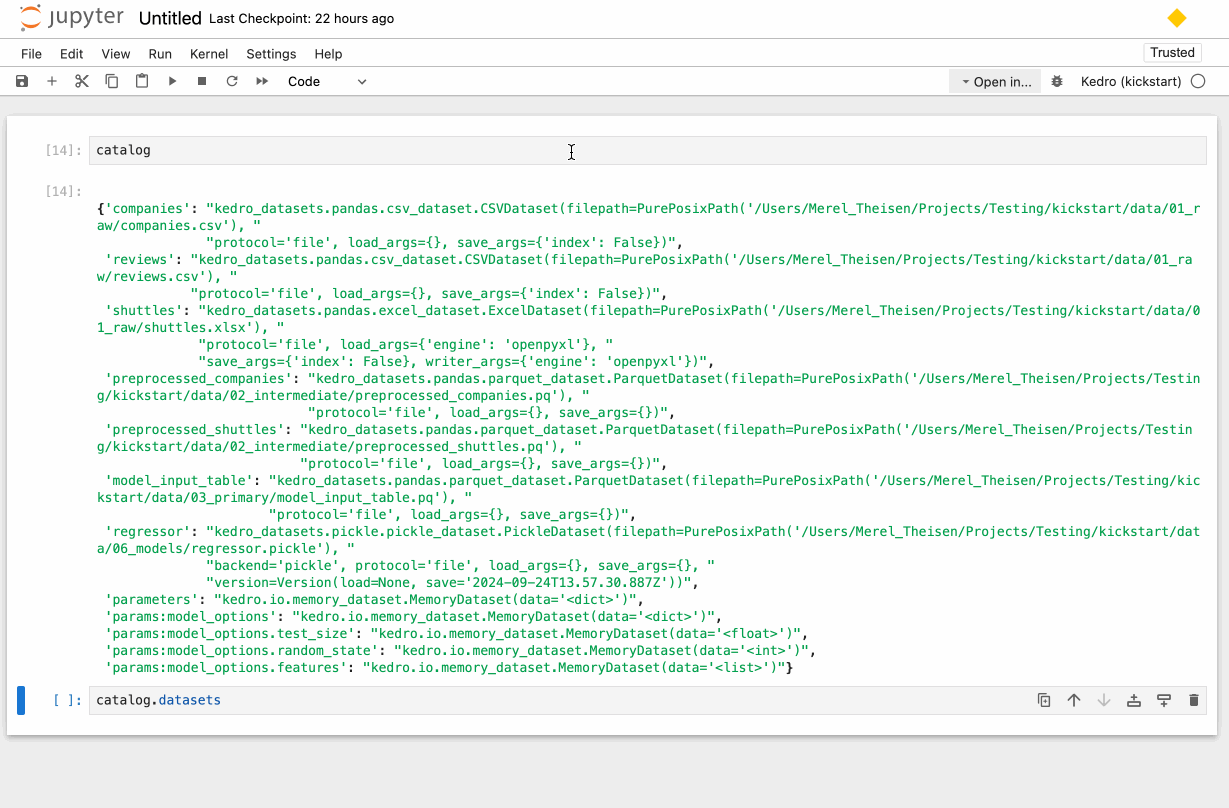 • Key completion: easily access datasets within the DataCatalog using key completion.